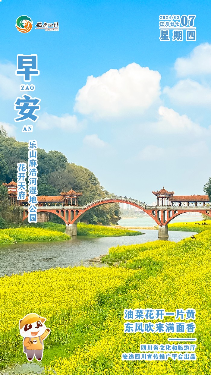 3月7日,星期四。今日安逸四川日历海报邀你去乐山麻浩河湿地公园,实现油菜花海自由~ 摄影:郭星 花开天府·乐山麻浩河湿地公园 麻浩河湿地公园位于乐山市中区,公园紧挨着麻浩渔村和乌尤寺,前...... 【详细】