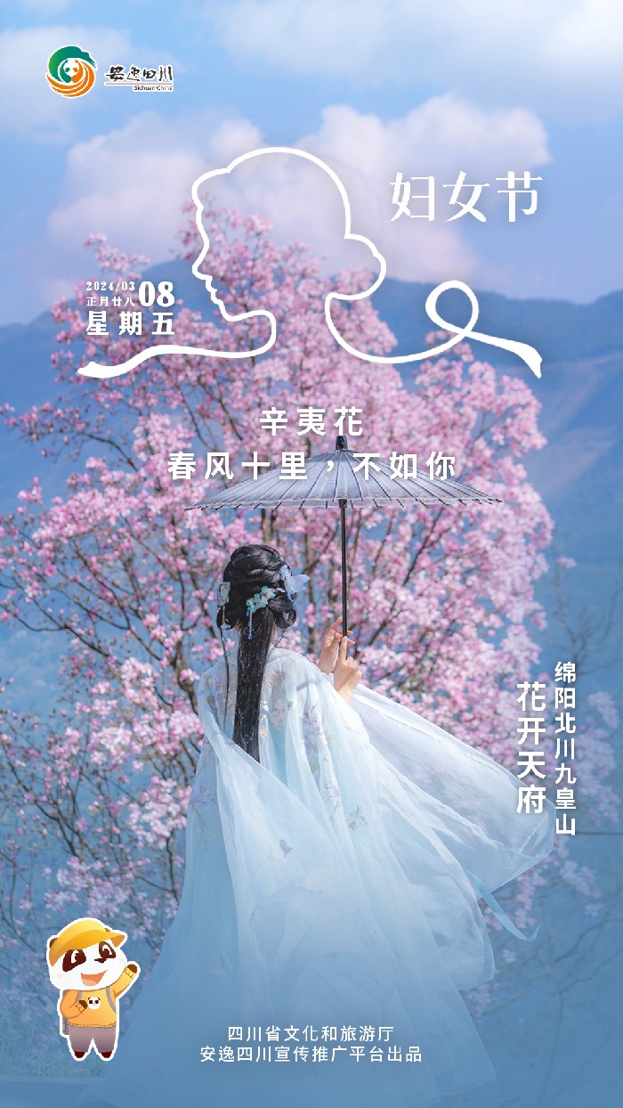 3月8日,星期五。今日安逸四川日历海报邀你去绵阳北川九皇山看辛夷花~ 花开天府·绵阳北川 每年3月中旬左右,九皇山粉色的辛夷花绽放山谷,展现出春天旺盛的生命力。 3月8日起,九皇山-花溪...... 【详细】