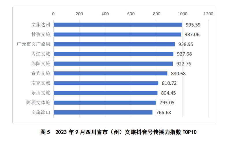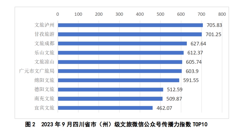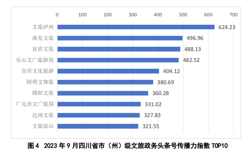 文旅头条号传播指数指标计算综合考量发文量、阅读量、图文收藏量、图文分享量、图文评论量、微头条点赞量、微头条评论量、微头条收藏量、直播评论量、涨粉量等。从2023年9月四川省市(州)文化和旅游行政部门头条号的表现看,前十位排名为:文旅泸州、南充文旅、宜宾文旅、乐山文广旅游局、自贡文化旅游、阿坝文体旅、绵阳文旅、广元市文广旅局 、达州文旅、文旅凉山。