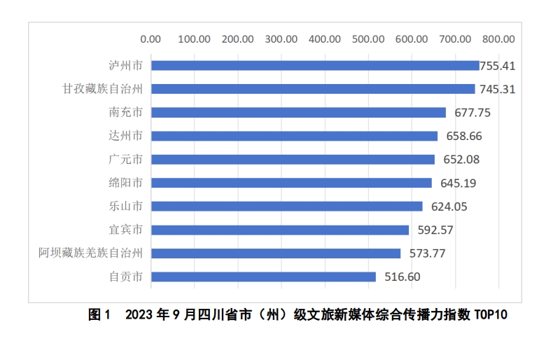 综合传播力指数评价维度由微信传播力、微博传播力、头条号传播力和抖音号传播力四个指标构成,权重分别为40%、25%、15%、20%。基于对四川省市(州)文化和旅游行政部门微信传播力、微博传播力、头条号传播力和抖音传播力的综合评价,2023年9月综合传播力指数前十位排名为:泸州市、甘孜藏族自治州、南充市、达州市、广元市、绵阳市、乐山市、宜宾市、阿坝藏族羌族自治州、自贡市。