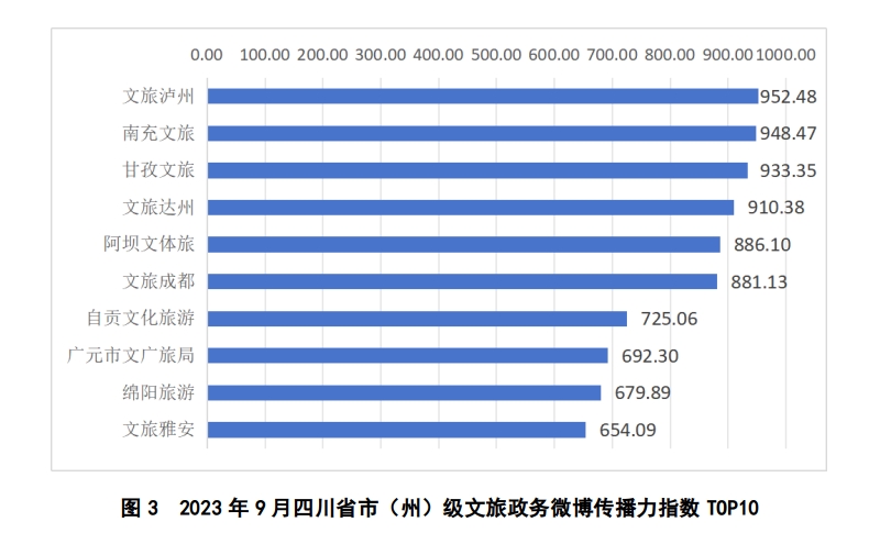文旅微博传播力指数指标包括发博数、原创微博数、转发数、评论数、原创微博转发数、原创微博评论数、点赞数等。从2023年9月四川省市(州)文化和旅游行政部门官方微博传播力来看,前十位排名为:@文旅泸州、@南充文旅、@甘孜文旅、@文旅达州、@阿坝文体旅、@文旅成都、@自贡文化旅游、@广元市文广旅局、@绵阳旅游、@文旅雅安。