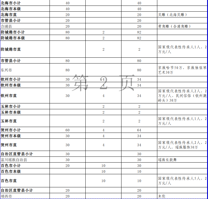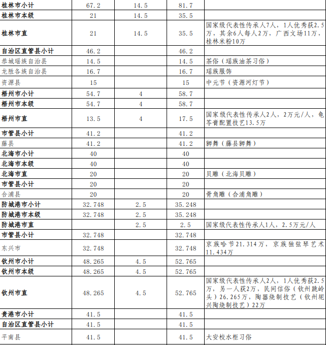 根据《广西壮族自治区财政厅关于提前下达2022年非物质文化遗产保护专项资金的通知》(桂财教〔2021〕159号)文件精神,自治区财政厅提前下达各市、县(区)专项资金1222万元(其中项目补助资金1146万元、国家级传承人补助76万元),用于支持各地市、县(区)保护单位开展国家非物质文化遗产保护工作;下达厅本级预算经费684万,计划用于“壮族三月三”项目活动90万;支持传统工艺工作站70万;广西壮族自治区戏剧院244万(壮剧、桂剧、彩调等三个项目各80万),国家级代表性传承人2人,2万元/人,共4万;4个传承人群研修培训班160万(先存留厅本级,再由厅财务转教育厅安排转至广西艺术学院80万元、广西民族大学80万元);广西非遗保护中心实施传承人记录工程80万以及非遗项目培训40万,共120万。