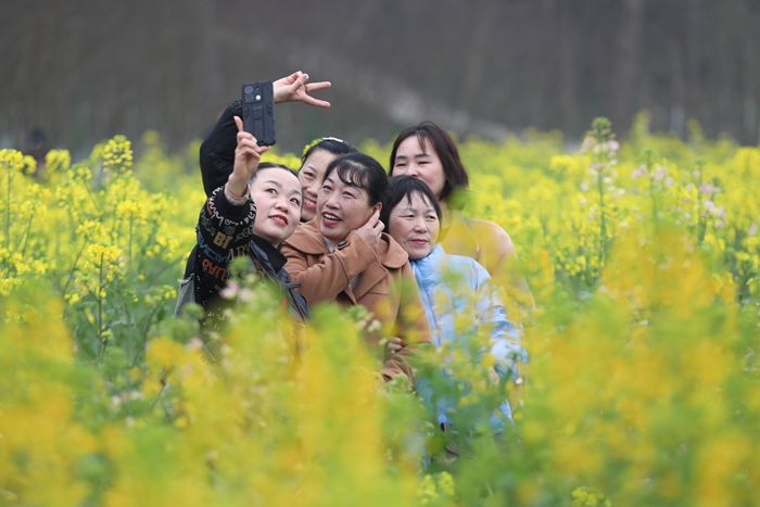 游客在油菜花田中观光打卡。 夏俊林 摄