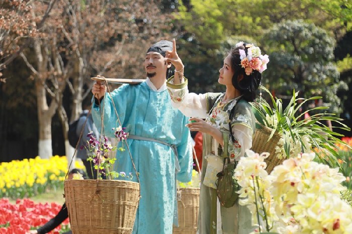 春日的阳光明媚,园中不断往来穿行着乐活惬意的市民和新奇拍照的游客。活动现场,如约而至的“十二花神”身着传统服饰惊艳亮相,与市民游客热情互动,为他们簪花赐福,尽显中式浪漫美学风采;惊喜现身的“挑花郎”和“背花娘”穿梭于人群之中……与此同时,挂红祈福和巡游活动也在公园内热烈上演,现场高潮不断,氛围浓厚,众人在欢声笑语中共赴花朝盛会。